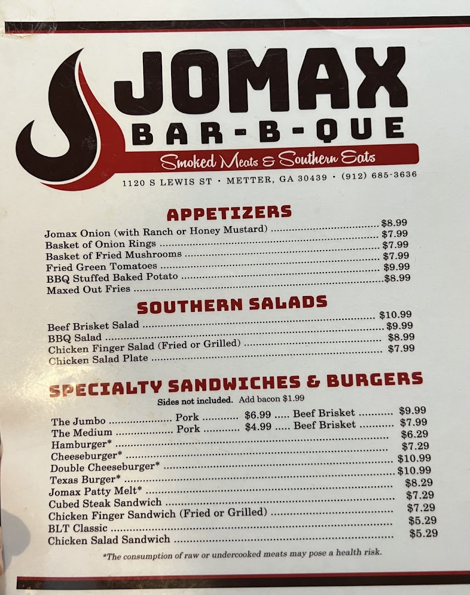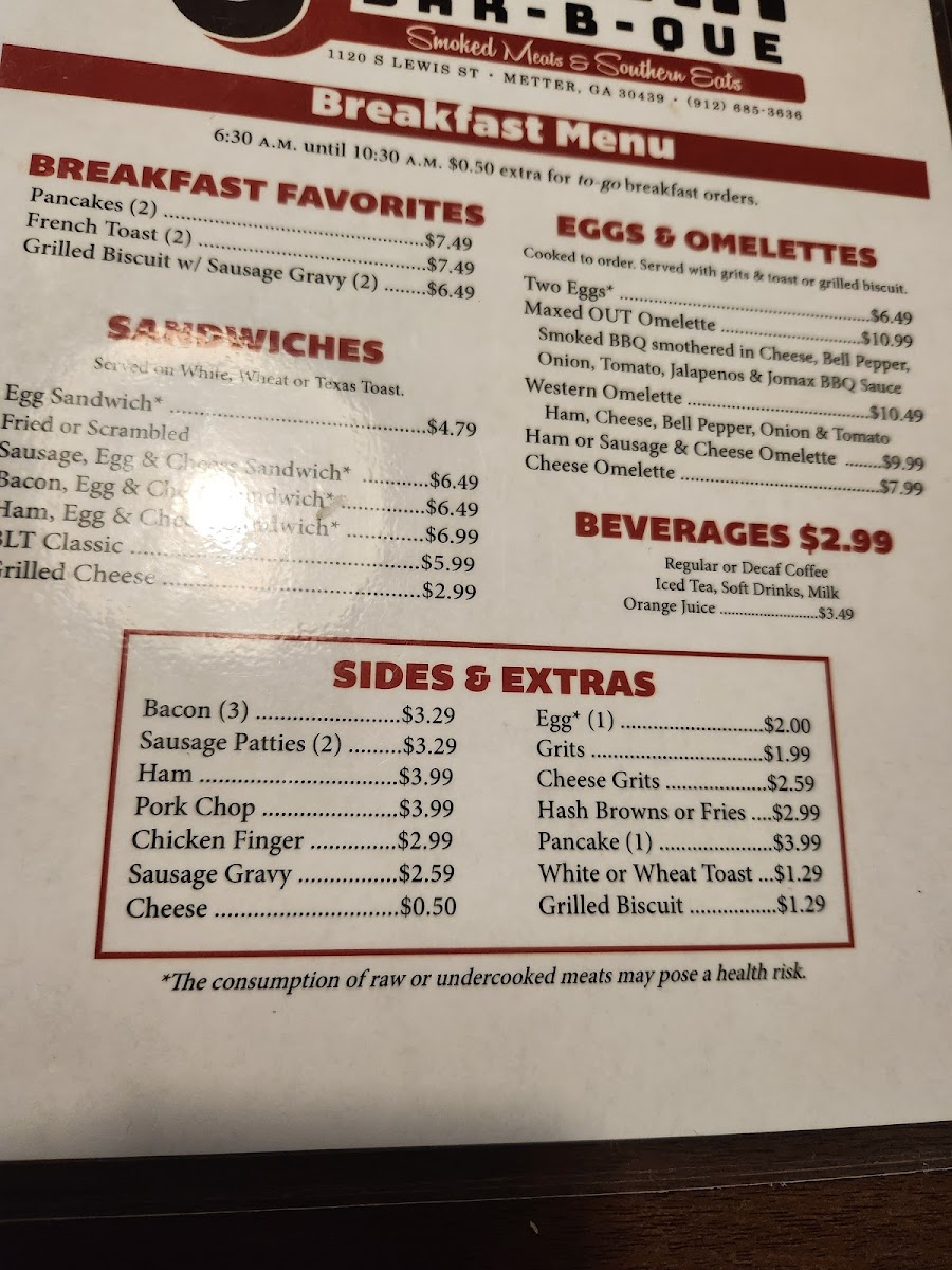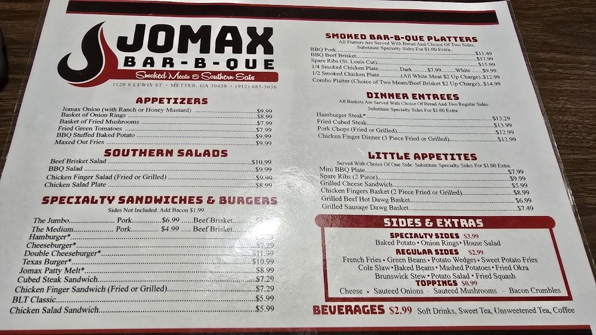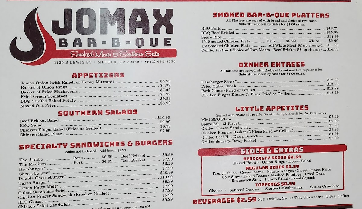 Welcome to Jomax BBQ, where mouthwatering flavors and hearty portions come together for an unforgettable dining experience! Nestled at 1120 S Lewis St, Metter, GA 30439, our menu boasts an array of specialties that are sure to satisfy your cravings. From our tender, smoky ribs to the savory pulled pork sandwich platter, each dish is crafted with care to bring you the best in BBQ goodness. Don’t miss out on our delicious sides like cornbread and lady fingers to complement your meal. Whether you’re in the mood for a juicy cheeseburger with fries or our signature Maxed Out Omelette, we’ve got something for everyone in the family. Come on down to Jomax BBQ and treat yourself to a feast that will leave you coming back for more!