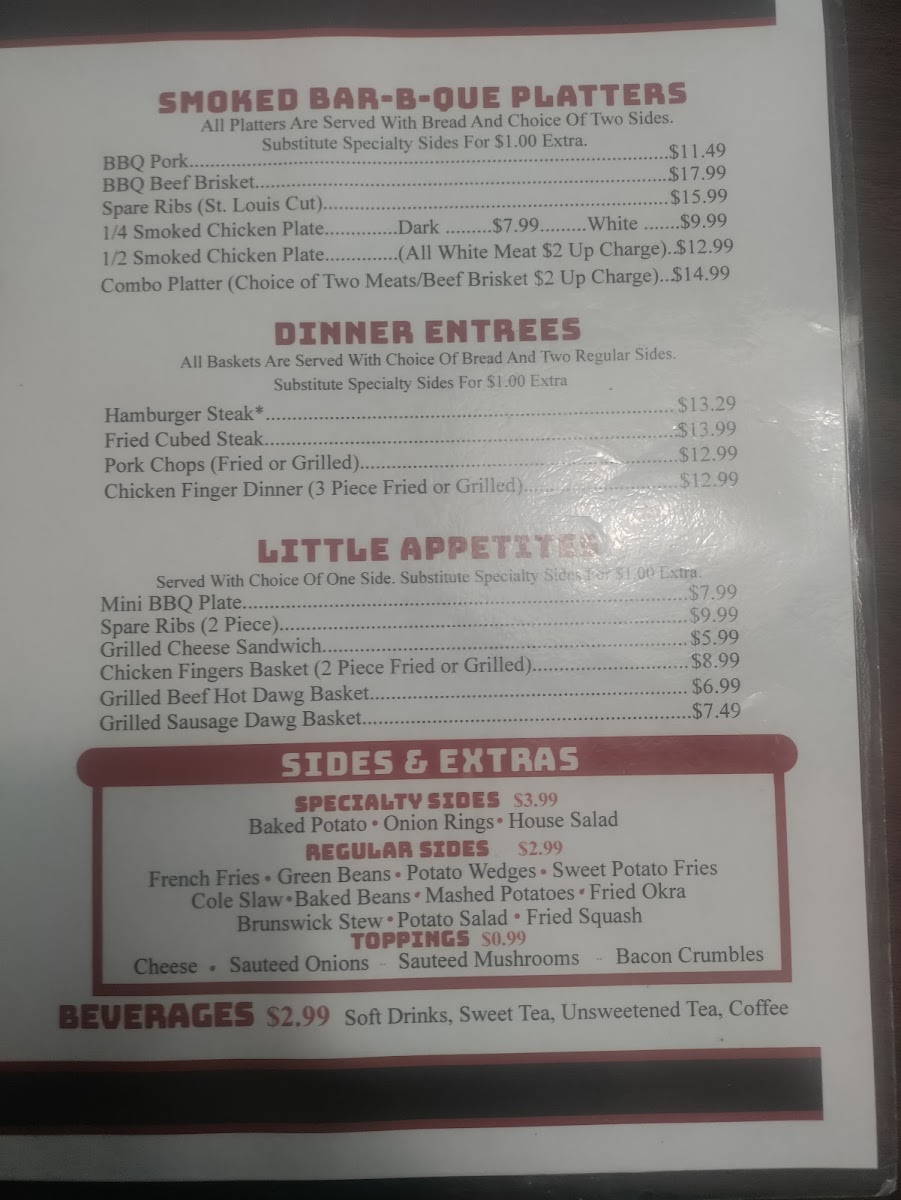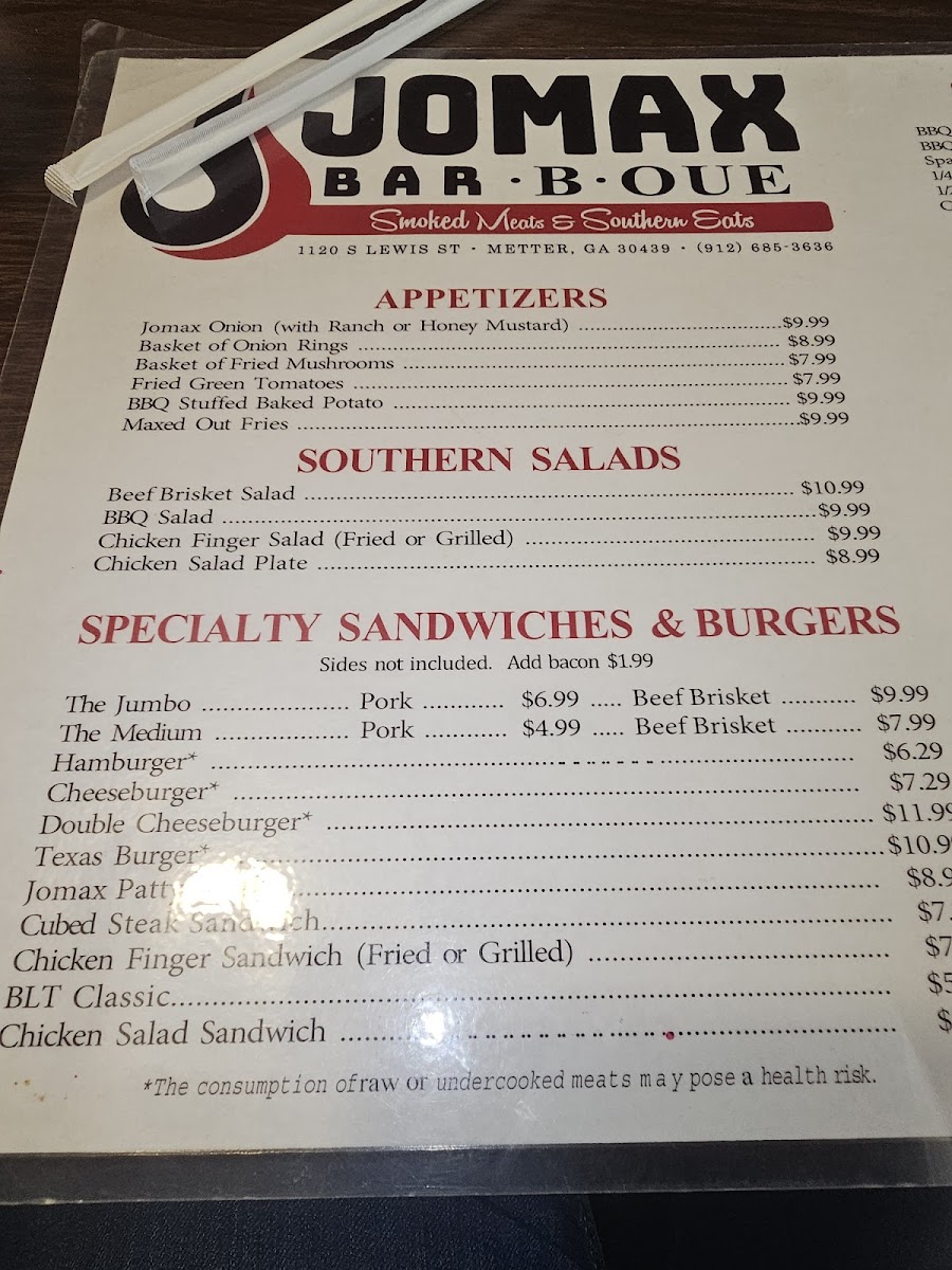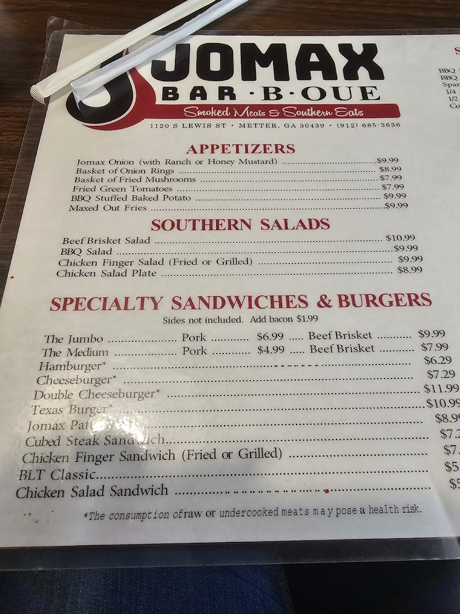Welcome to Jomax BBQ, where mouthwatering flavors and hearty portions come together for an unforgettable dining experience! Nestled at 1120 S Lewis St, Metter, GA 30439, our menu boasts an array of specialties that are sure to satisfy your cravings. From our tender, smoky ribs to the savory pulled pork sandwich platter, each dish is crafted with care to bring you the best in BBQ goodness. Don’t miss out on our delicious sides like cornbread and lady fingers to complement your meal. Whether you’re in the mood for a juicy cheeseburger with fries or our signature Maxed Out Omelette, we’ve got something for everyone in the family. Come on down to Jomax BBQ and treat yourself to a feast that will leave you coming back for more!